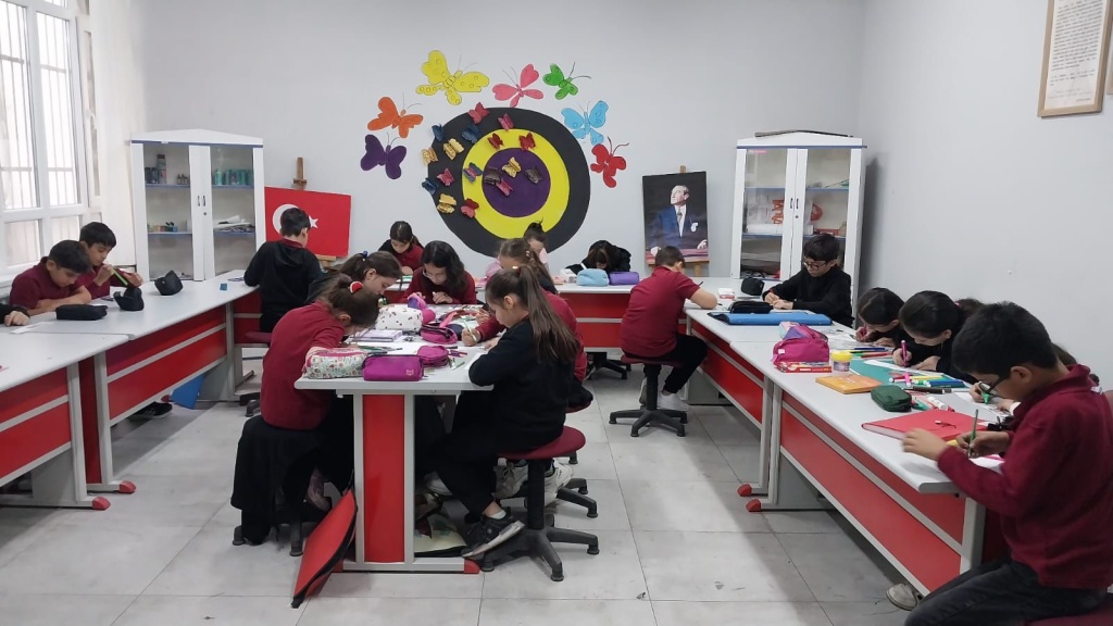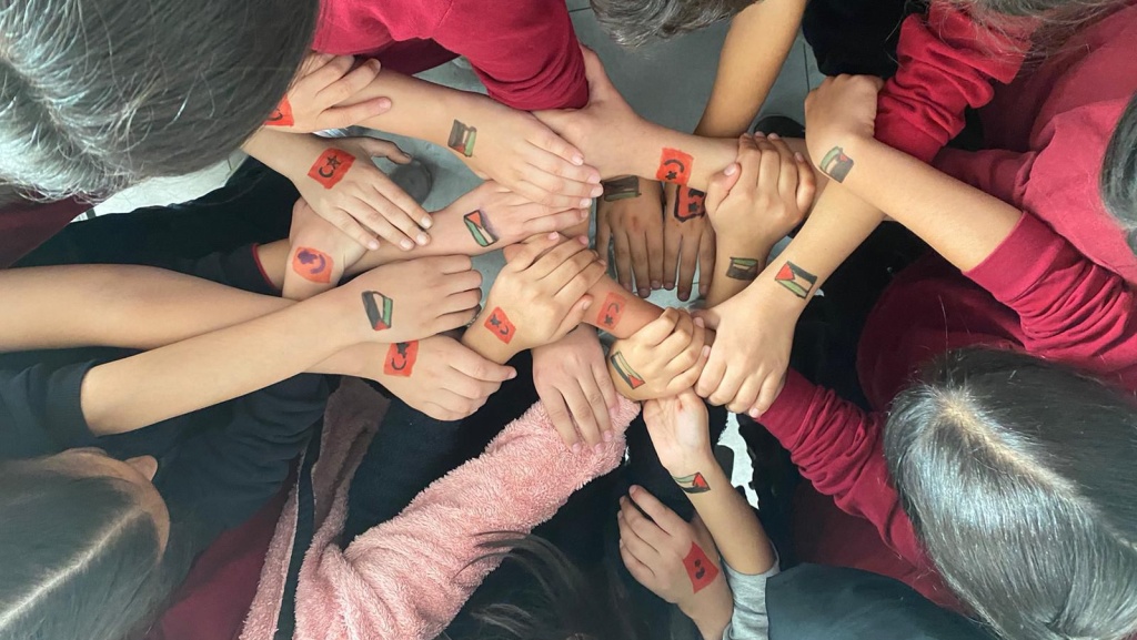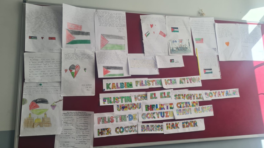 “Özgür Filistin”, “Kalbim Seninle Filistin”, “Gökyüzü Mavi Olsun” gibi mesajların yer aldığı panolar, okul koridorlarımızı anlam ve duygu dolu bir Filistin sokağına dönüştürdü.