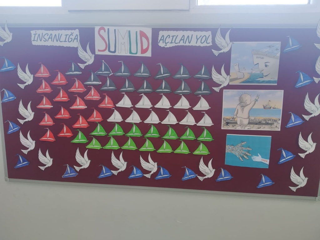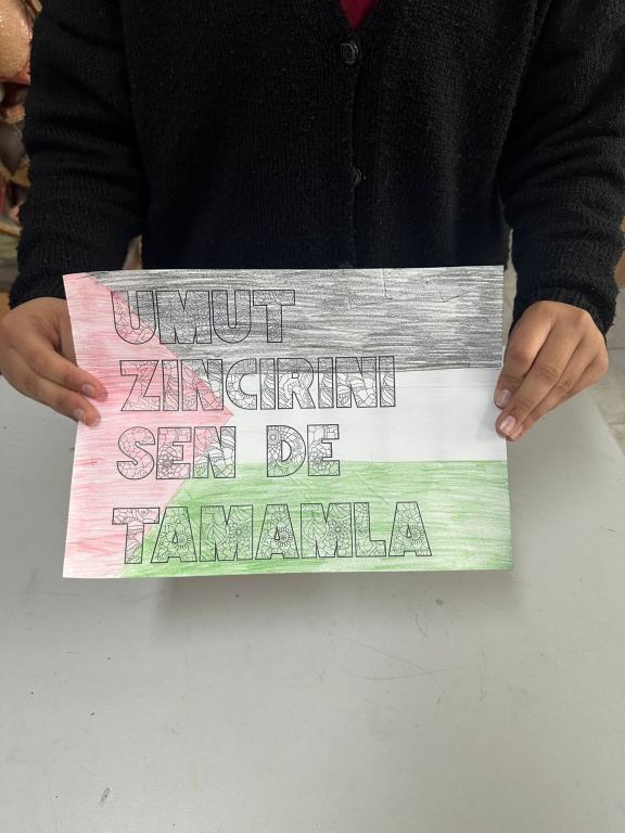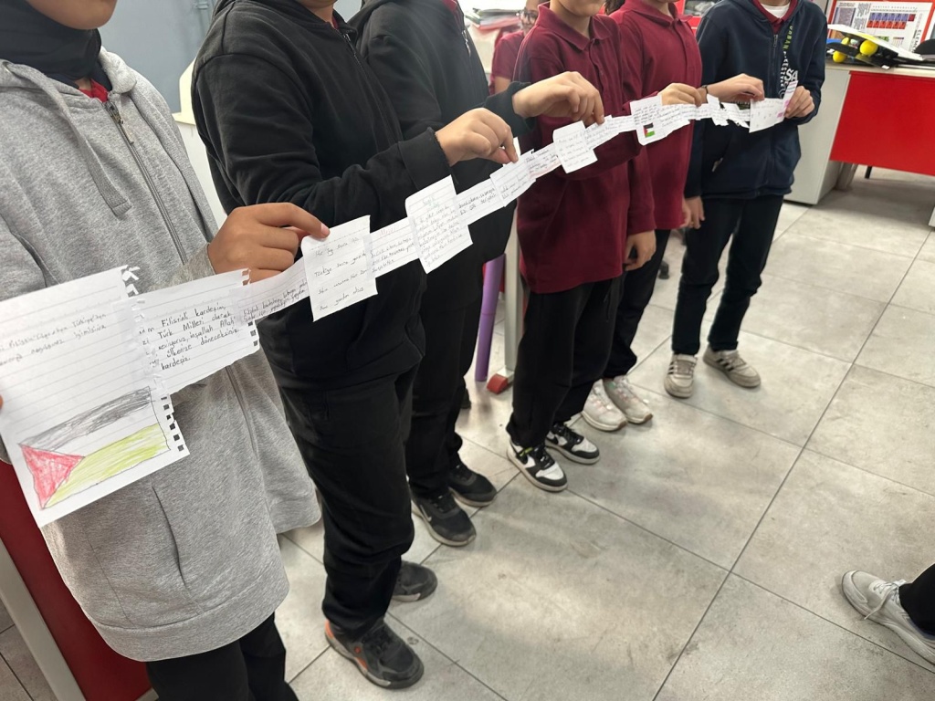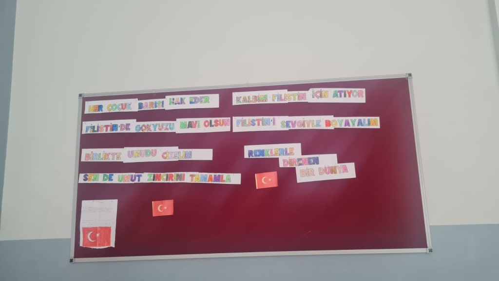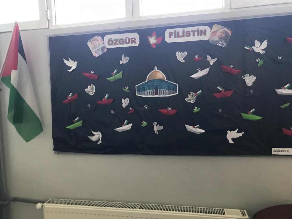 Okulumuzun dört bir yanında asılı duran afişlerde “Kalbim Seninle Filistin”, “Gökyüzü Mavi Olsun” ve “Filistin İçin Adalet” gibi ifadeler yer aldı.